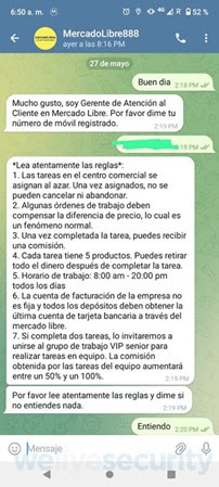 Otro ejemplo que también se vale de Mercado Libre para generar interés, es el supuesto Gerente de Atención al Cliente que detalla las tareas que la víctima debería desempeñar.